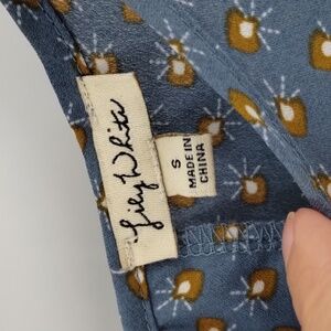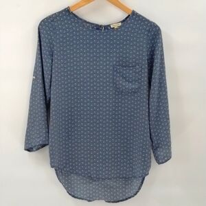 Lily White blue with gold print size small blouse front pocket flowy 3 quarter