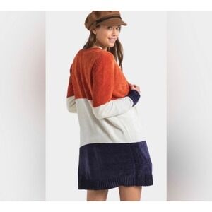 Women’s colorblock cardigan, open front sweater, long sleeve knit cardigan, rust cream navy cardigan, cozy fall layering piece, soft chenille cardigan, ribbed hem cuffs, casual chic cardigan, multicolor block sweater, lightweight knit layering