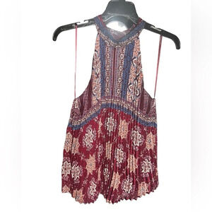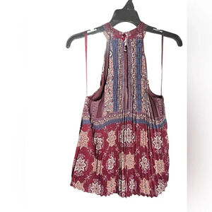 SEO keywords: boho halter tank, festival top, flowy pleated blouse, hippie chic tank, summer layering piece, patterned sleeveless top