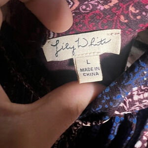 Boho-inspired and breezy, this Lily White tank features a halter neckline, pleated flowy hem, and a rich red and blue patterned print. Fully lined for comfort and in excellent condition. Perfect for pairing with denim shorts, jeans, or skirts for an easy bohemian look.