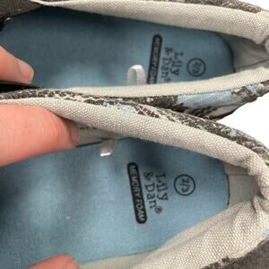 Blue, grey, black and white in color. Slip on sneakers.