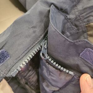 Navy blue ski bibs Elastic and adjustable straps Elastic around boots and Velcro for adjustable sizing Excellent condition