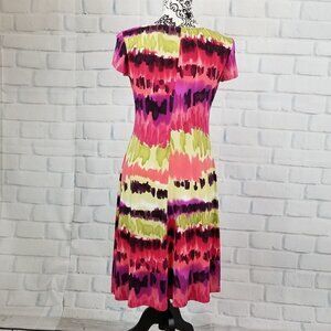 This is a women's pre-owned stretch knit geometric print dress that comes in a size small and is made by Lily and has a twisted front.