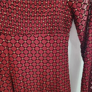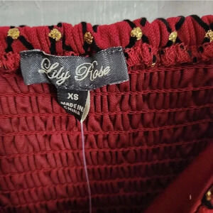 Gorgeous dress! New with tags! Junior size XS! The color is like a maroonish.....(might look different to your eyes) Has Gold and black throughout! Arms are sheer. SF/PF