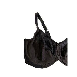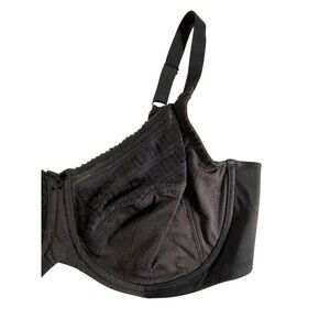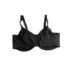 The Lilyette Minimizer Bra in size 42DD is a black underwired bra with a lace trim and hook & eye closure. Made of nylon with a lace fabric type, this plus-size bra offers full coverage, back closure, adjustable straps, and is part of the Lilyette product line. Designed for women, this bra provides support and comfort while adding a touch of elegance with its lace accents.