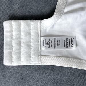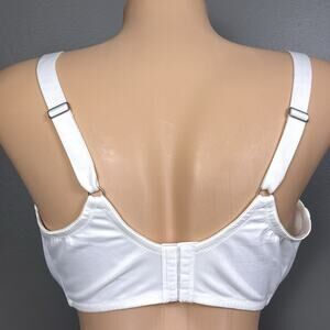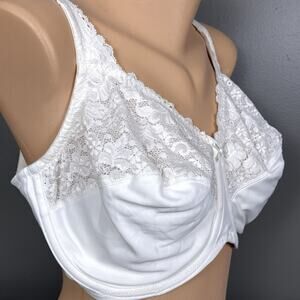 The Lilyette Minimizer Maidenform Size 40DDD White Style 428 is a classic solid white underwired bra with full coverage and adjustable straps. Made of nylon blended fabric with lace accents, this bra features a hook & eye closure and a back closure for added comfort and support. Perfect for women looking for a minimizer bra with a DDD cup size, this Lilyette bra is designed to provide a flattering fit while being easy to care for. Excellent preowned condition.