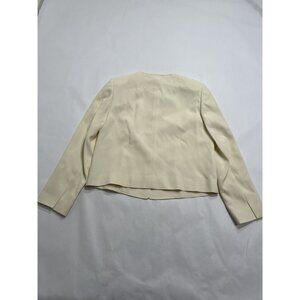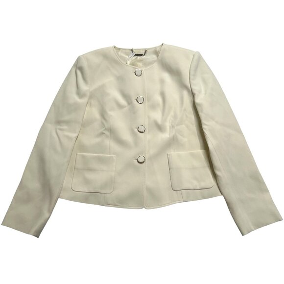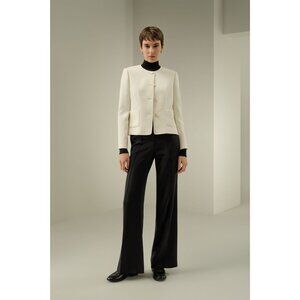 Description from retailer: This structured boxy jacket in heavyweight silk crepe balances minimalist tailoring with effortless elegance. Lightly padded shoulders and symmetrical patch pockets create clean lines, while the round neckline adds subtle softness. The hypoallergenic silk fabric with chiffon lining ensures breathable comfort, making it a versatile layer for workwear or weekend outfits.