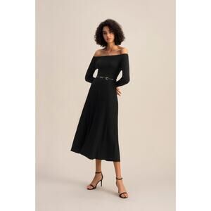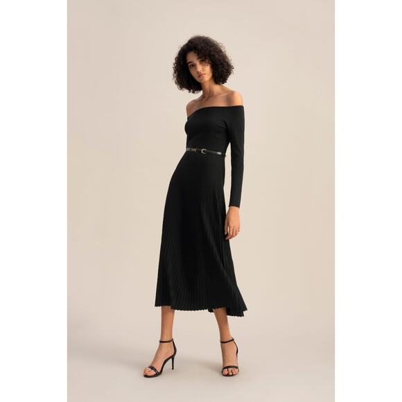 Design details: Off the Shoulder or can be worn on the shoulder. fitted ribbed upper body, defined waist seam, and flowing pleated midi-length skirt; pullover style with stretch knit fabric.