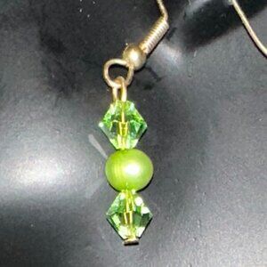 A three-tiered 20" necklace set made with lime green freshwater pearls and peridot Swarovski crystals. Earrings are set on wire hooks. This is a handmade one-of-a-kind set.