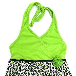 Little girls like green leopard animal print dress, halter neck line, flower decoration, can be dressed up or down, gently worn good preowned condition, cute summer dress