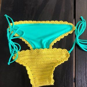 Lime/electric green & teal cheeky bikini handmade by me! Straps and linings are made from lycra/spandex, yarn is elastic. Safe to wash and great to swim! Custom orders available size XS-XL