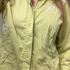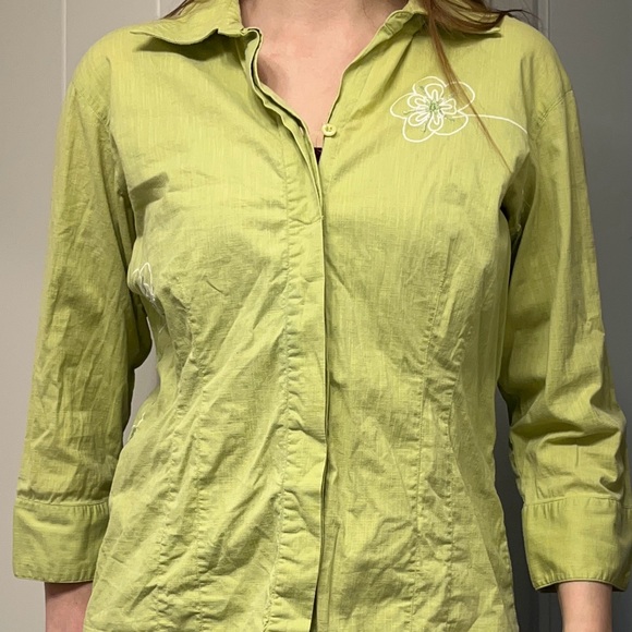 Add a pop of color to your wardrobe with this lime green button down shirt. Featuring elegant floral embroidery, it's perfect for both casual and formal occasions.