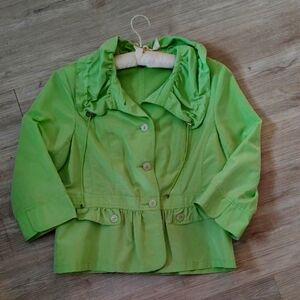 This Lime green rain jacket is designed with a lightweight fabric, making it perfect for spring and summer. It features a structured silhouette with charming ruffle details at the waist and neckline. 3/4" sleeves give it a retro flare