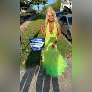 This is a Small , lime green prom dress. I paid $850 for it. I wore it for 1 hour . I’m looking for $650 but the price is negotiable.