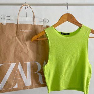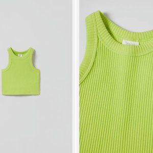 Basic ribbed tank top from Zara in a bright neon green color. This has been worn several times, but looks brand new and has zero signs of wear. This is slightly cropped and does not have much stretch.