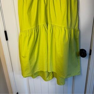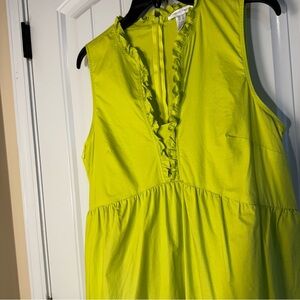 Vibrant lime green sleeveless dress with tiered design with mini ruffled v-neck, hi-low shirt, zippered back and pockets. Perfect for a casual day out.