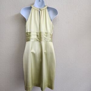 lime green, satin, bow tie at waist, sleeveless, v-neck, back zip closure, keyhole back, lightweight, soft, dressy, cocktail, lined, vented back seam, shiny, padded bodice, sheath