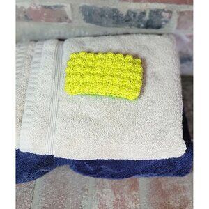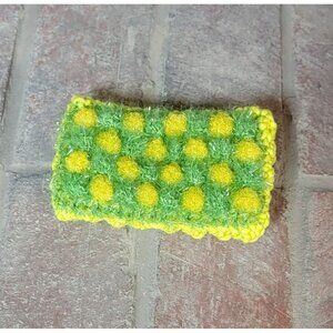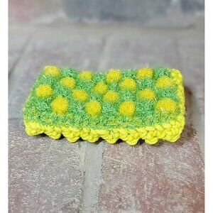 Handcrafted lime green and yellow kitchen scrubby. Two-sided. One side is more abrasive than the other, so you can choose a deeper or lighter scrub. There is a sponge inside to create more foam. It’s very versatile to fit your needs and can be washed in the laundry for long-term use over and over again. Approximate measurements: 6 in x 6 in x 2 in.