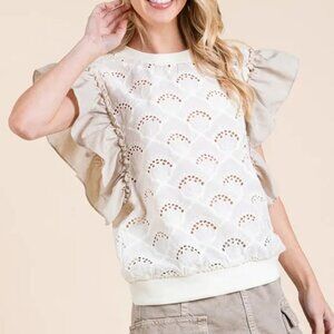 *Enhance your outfit with this elegant Ruffle Cap Sleeve Embroidered Eyelet Blouse. The ruffle cap sleeves add a feminine and delicate touch to the blouse. The embroidered eyelet detailing offers a chic and stylish look. Perfect for dressing up a casual outfit or adding sophistication to your workwear. Pair with trousers or a skirt for a versatile and polished ensemble. Embrace a trendy and classic style with this beautiful blouse.