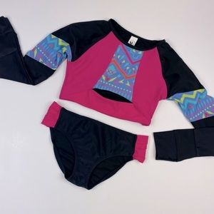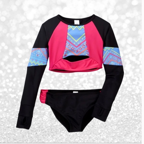Style: rash-guard top with front keyhole & thumb holes, bikini bottom