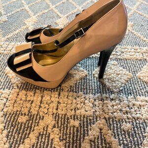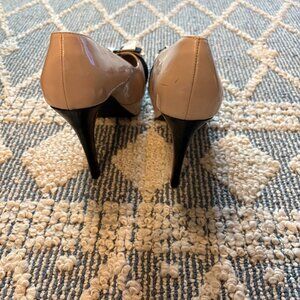 Super cute shiny tan & black heels with a classy bow! Wear them out dancing, to a wedding, work formal events, work, clubbing, wine tastings- wherever!