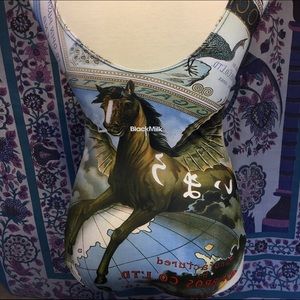 This is the coolest, limited edition swimsuit by Black Milk. A winged horse smoking a cigarette was originally an image for an antique cigarette company and now graces this rare suit. Never worn in water, this piece comes with original packaging and sticker.