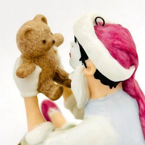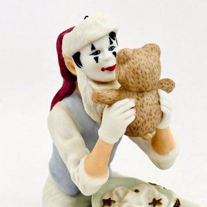 Beautiful Hallmark limited edition ornament. Hand painted porcelain mime with a bag, holding a toy bear. Exceptionally beautiful and in great condition. There is a small loop on the back of the head, if you choose to display hanging on an ornament stand or a tree, but it's a nice option that it could just be sitting on a shelf as well. Great overall condition. No flaws noted. The size is approx. 3.5" x 3.25".