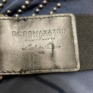 Fall 2010 BCBGMAXAZRIA RUNWAY Asymmetric Sheath in Carbon Navy Blue with Gunmetal Studs. Belted with a pleated overlay. 100% poly Satin. Fully lined. Belt is black leather and wide band elastic. Approximate flat lay measurements in pics. Excellent condition.
