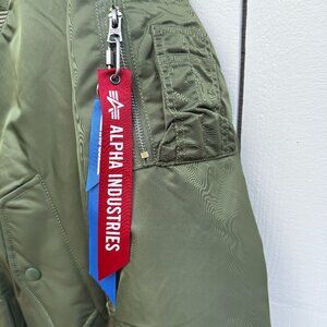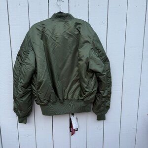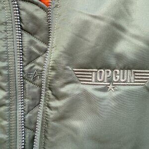 Limited Edition Top Gun bomber jacket in Army Green with Orange interior. Inspired by the original jackets worn by U.S Air Force and Navy pilots in the 1950's. Inclues embroidered Top Gun Logo and blue and red shoulder flight tags.