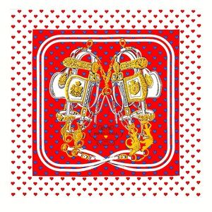 Rare, Limited Edition HERMES 90cm Silk Scarf. Style name is Brides De Gala Love. Color is Rouge Vif. The scarf comes in a heart shape box which is something Hermes has only designed once. The scarf has never been worn and includes all original tags and a unique pamphlet with direction on how to wear and fold.