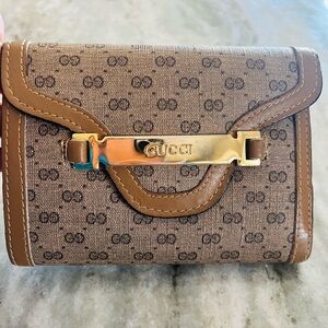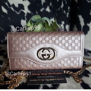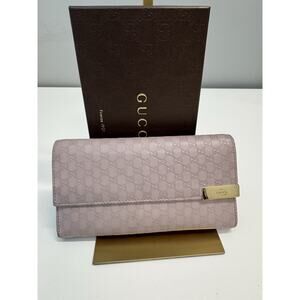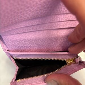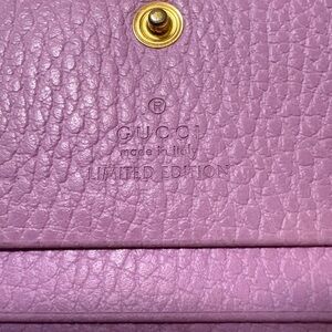 This is a limited edition Gucci GG Marmont Bosco bifold card case wallet in malva (pink) calfskin leather.