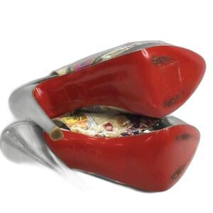 These unique pumps are part of Christian Louboutin's "Trash Collection," known for incorporating recycled materials from the designer's atelier in Paris under a clear PVC layer.