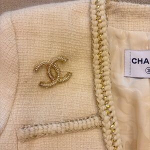 Elevate your accessory collection with the timeless elegance of this classic Chanel CC brooch. Adorned with sparkling crystals that catch the light beautifully, this gold pin showcases the iconic design synonymous with luxury and style. The intricate craftsmanship reflects the brand's commitment to quality, making it a standout piece. Included with the brooch is its original box, ensuring safekeeping or making it a perfect gift for a Chanel enthusiast. Whether it's to accentuate a lapel on a formal outfit or to add a touch of glamour to a scarf, this brooch promises to be a versatile addition to any wardrobe.