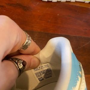 Limited edition mismatch Collina strada reeboks. Ivory base Reebok Classic Leather Sneakers. Like green and sky blue mismatch patterns on each foot. Collina Strada name on shoes. The words Call Mom on the back of the heels. Normal scuffs on sole but good condition. 7.5 women’s and fit true to size. Message me with any questions or offers.
