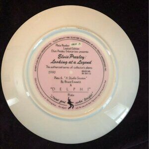 This collector's plate celebrates the iconic Elvis Presley, capturing a vivid studio session scene. Produced in 1990, it's a limited edition piece by the renowned Delphi. An ideal addition to any Elvis memorabilia collection, this plate stands as a testament to the enduring legacy of the King of Rock and Roll.
