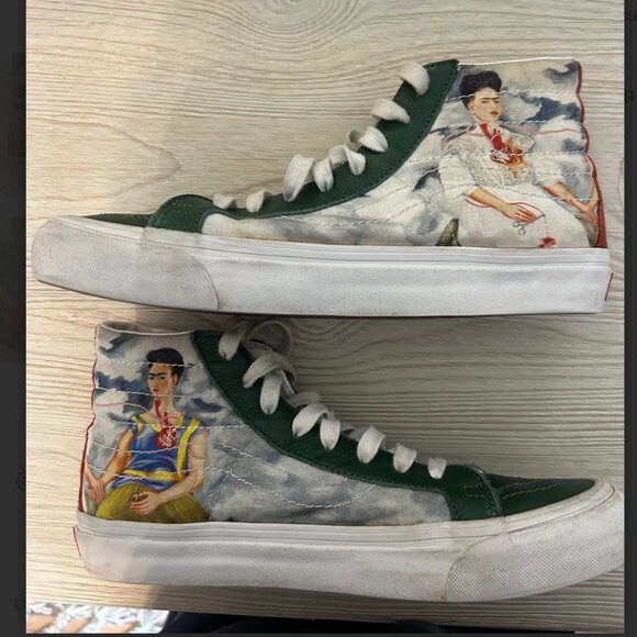 These are womens' size 11, mens' size 9.5 Vans with a Frida Kahlo painting on them from the Frida Kahlo Vault Vans collection. They have been lightly worn and are in good condition, but have a few signs of wear and tear on the soles as shown in the photos.