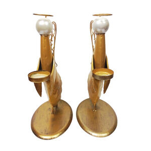 Set of 2 Gold Metal Angel Silhouette Votive Candle Holders w Pearl Heads on Stands are in used, but in Great condition.