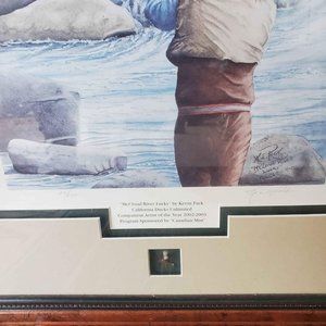 Limited Edition "McCloud River Lucky" Flyfishing Scene Print by Artist Kevin E. Pack. California Ducks Unlimited Companion Print/Artist of the Year 2002-2003. Framed, with two metal hooks on each side, exclusively for Ducks Unlimited by Fine Arts Framing, Inc. in Huntington Beach, CA. Program Sponsored by "Canadian Mist" in April 2002.