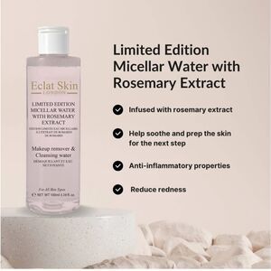 Beloved by makeup artists, micellar water removes dirt and makeup with a few swipes of the formula on a cloth (no rinsing needed). Eclat Skin Limited Edition Micellar Water with Rosemary Extract feels amazing on a hot, sticky day—a perfect way to refresh skin on the go or reset at the end of the day. Shake a few drops onto a reusable cloth, and smooth it over your skin to cleanse anywhere, anytime.