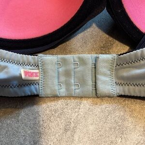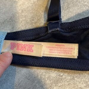 Used in great condition, Limited Edition Pink Wear Everywhere Demi lightly line navy & light blue 36DD. Some minor wear at underwire. Fully adjustable straps, can go racerback. Pink written on back-strap in gold with a couple minor cracks.
