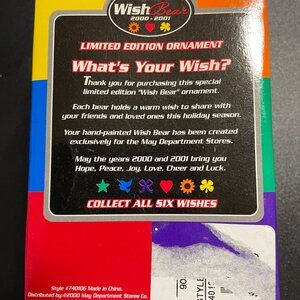 The adorable bear is decked out in purple offering the wish of joy. This Limited Edition Christmas ornament is by May Department Stores and is part of the Six Wishes Series (Hope, Peace, Joy, Love, Cheer & Luck). It comes in the original box.