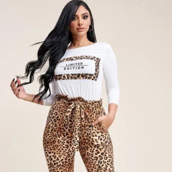 Eyecatching 2pc set with stretchy leopard print paper bag pants with pockets and leggings fit. Premium cotton fitted top with 3/4" sleeve. Runs true to size.
