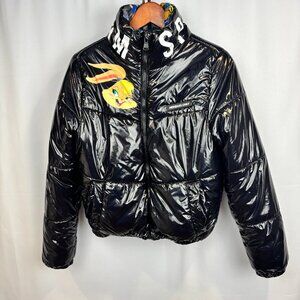 Great condition, Limited Edition Space Jam x Members Only Shiny Puffer Jacket. This jacket is not only warm and comfortable but also an attention-grabber with its reflective, high-gloss finish and iconic character design. Perfect for fans of Looney Tunes or Space Jam, this puffer jacket is a rare find that will make your outfit stand out wherever you go.