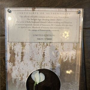 Limited Collectors Edition Twilight Saga Breaking Dawn Part 1 DVD. Features 2 disc set. Includes authentic collectible prop flower from the movie, its plaque number 34,619 out of 158,000. Perfect for fans of the series.