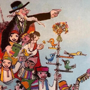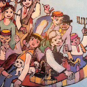 A group of children gathered together on a flying carpet, some precariously swinging off the edge, this print features artifacts of Jewish life scattered throughout the image.