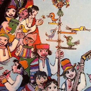 A group of children gathered together on a flying carpet, some precariously swinging off the edge, this print features artifacts of Jewish life scattered throughout the image.