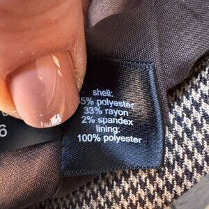 Elevate your wardrobe with this houndstooth blazer from The Limited. Designed for the discerning woman, it offers a flattering fit with sophisticated suede elbow patches. This blend of polyester, rayon, and spandex ensures comfort and durability. Ideal for professional settings or adding a touch of class to casual outfits.