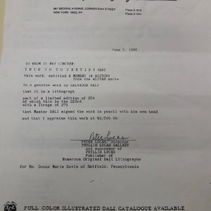 Salvador Dali original Certification letter by Old Print Center and Phyllis Lucas Gallery.