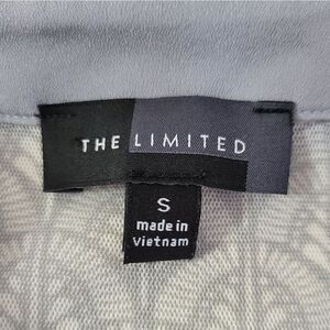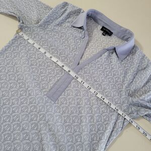 Light and breezy, this semi-sheer pullover knit blouse by The Limited features a repeated shell pattern accented by a solid light gray collar and v-neckline. The elbow-length sleeves are finished with a simple buttoned cuff. Tucked in or worn out, make the top your own with every wear, no matter the occasion. Excellent condition.