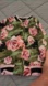 Chic jacket with pink floral pattern on a green camo base. Features a stylish zipper and ribbed collar.